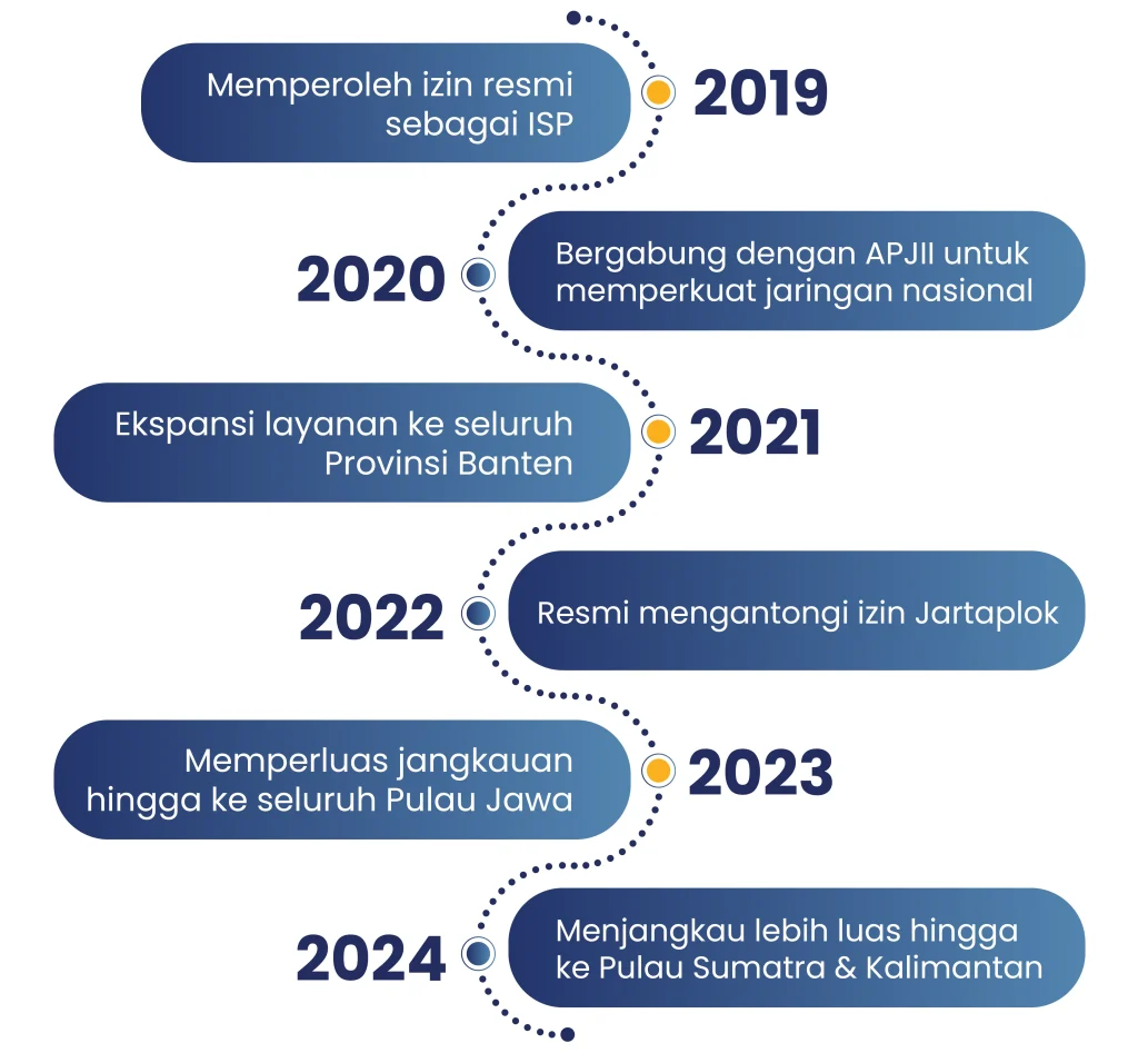 Sejak berdiri, PT. Putra Lebak Banten terus tumbuh dengan komitmen menghadirkan layanan internet terbaik. Dari izin awal hingga ekspansi lintas pulau, setiap langkah adalah bukti dedikasi kami untuk mendukung konektivitas nasional.