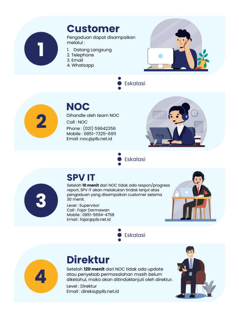 Setiap laporan gangguan ditangani secara terstruktur dan transparan. Melalui sistem eskalasi yang jelas, tim teknis PLB Net memastikan setiap kendala terselesaikan cepat dan pelanggan tetap mendapatkan pengalaman koneksi terbaik.